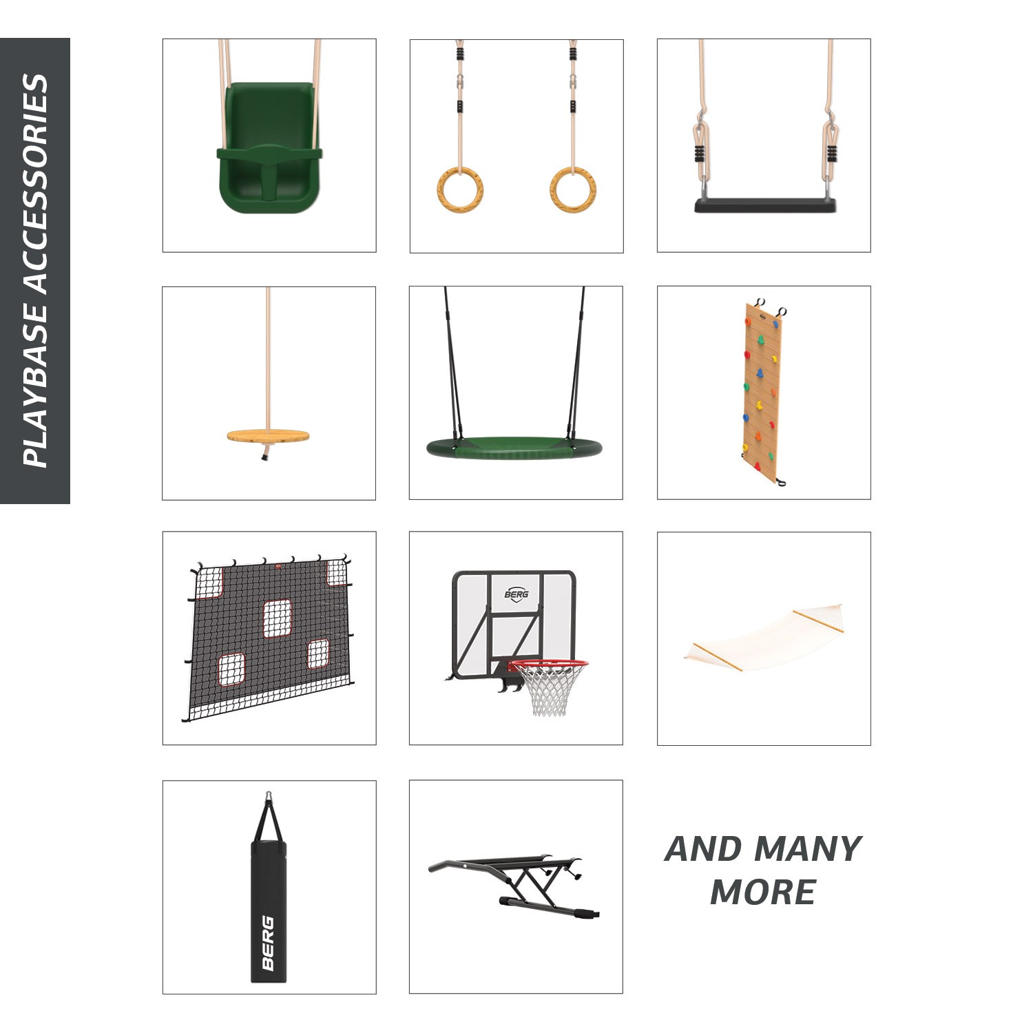 Enjoy endless possibilities with the BERG PlayBase. With the sturdy and robust frame and the patented tube connection system, this climbing frame and play frame is designed to last for many years. The tubes have a large 9 cm diameter for unprecedented rigidity. With this, we offer a warranty for up to 13 years for you to enjoy carefree workouts, play or lounging.