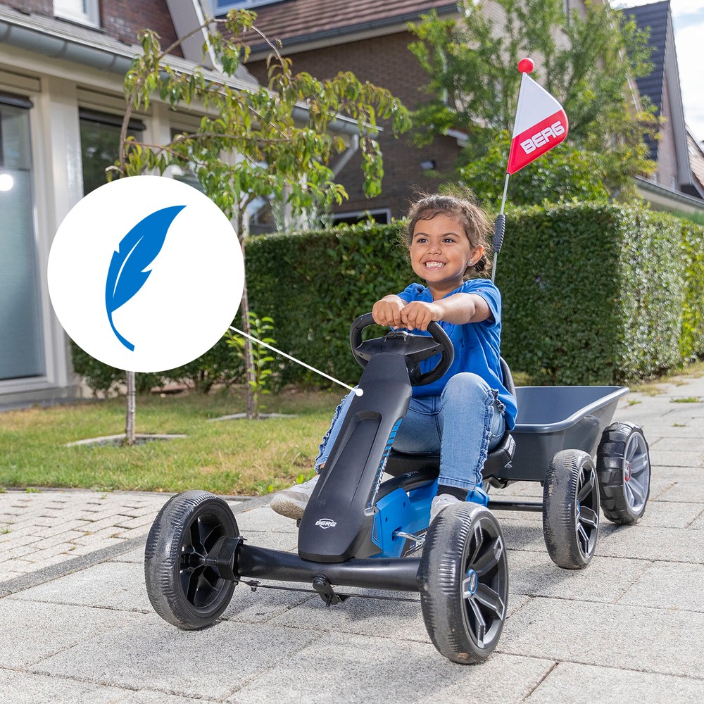 Age Group: 2.5 - 6 years old •Equipped with 10’’ inch EVA tyres that will never go flat •The swing axle ensures children always maintain grip on the road •The cool bucket seat has a knob for easy seat adjustment •Adjustable seat in 4 positions •Easy to lift up using the frame handle •The direct drive system makes pedalling easy •Sleek and attractive design •The steering wheel comes equipped with soundbox Product weight: 9kg Product dimensions: 98x59x58 cm Max. User Weight: 40kgWhen you go out on the pavement on the Reppy Roadster, all eyes will be on you. Because with the BERG Soundbox you can be sure everyone will hear you starting the engine, accelerating or applying the brakes. And if they're not paying attention, you beep the horn. This means you always get everyone's attention. Racing with the Reppy Roadster is a fantastic experience. Cool design, low bucket seat and professional sports steering wheel are exactly what you as a young driver will get excited about. The direct drive system ensures a smooth drive and makes it just as easy for you to go forwards as backwards.