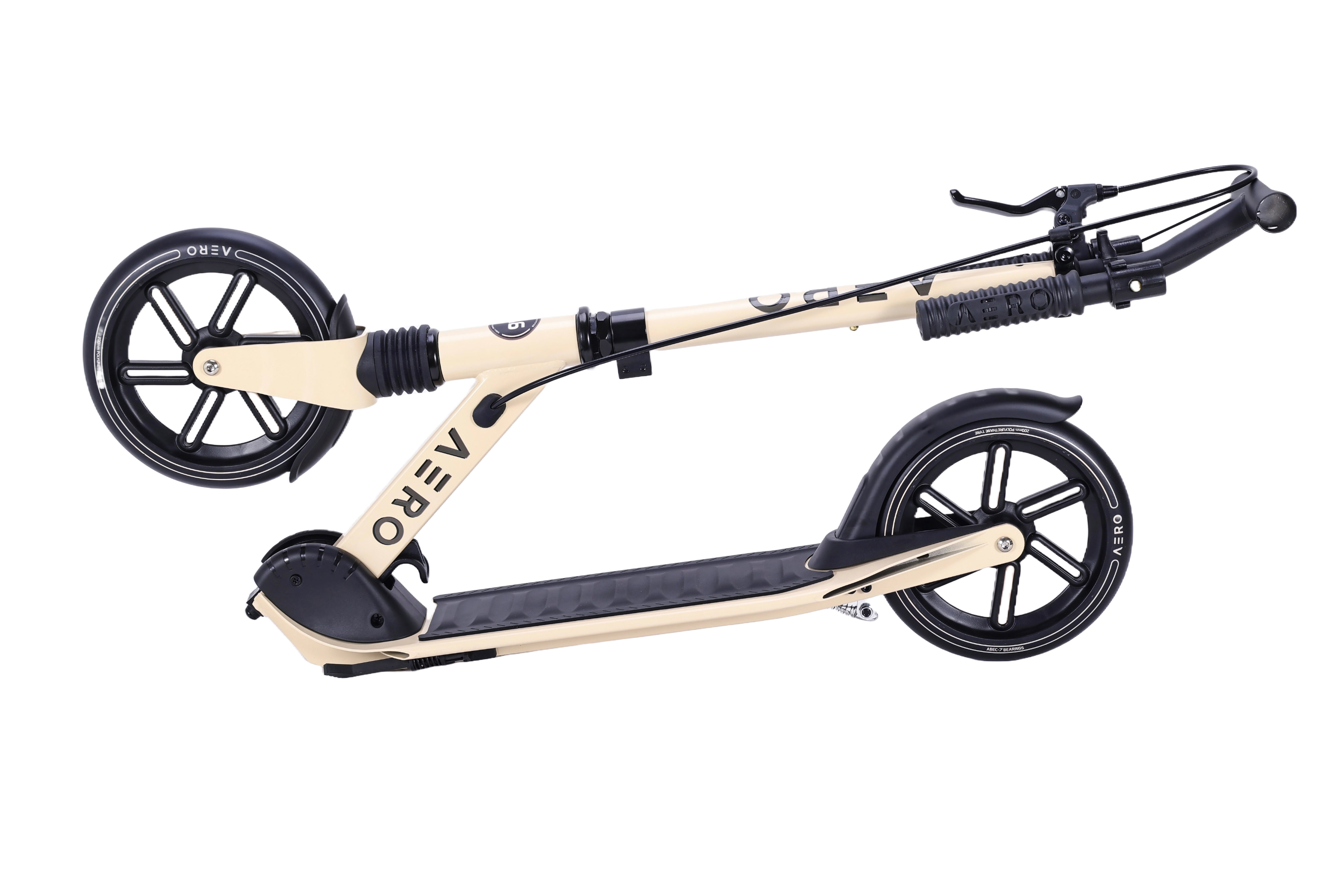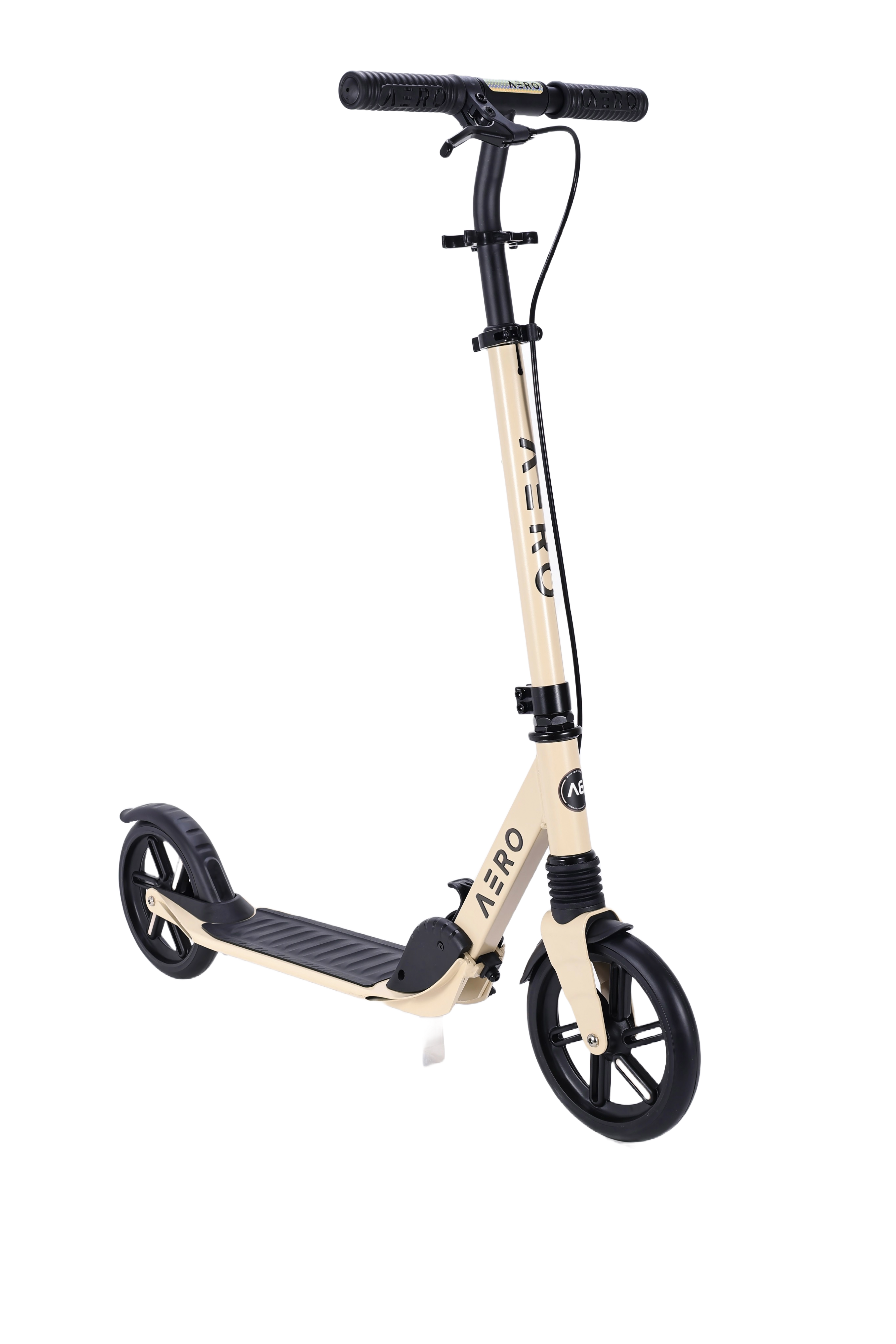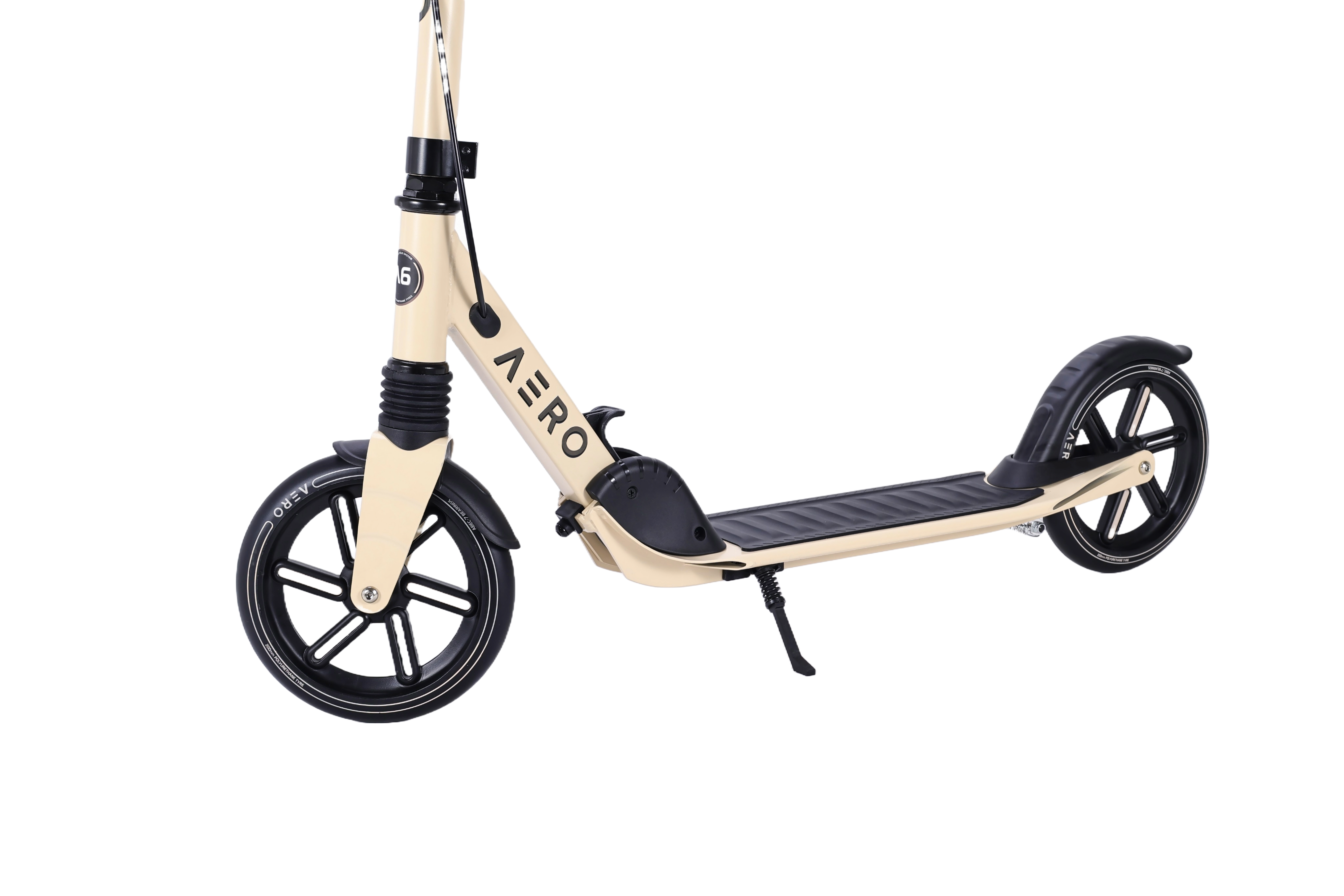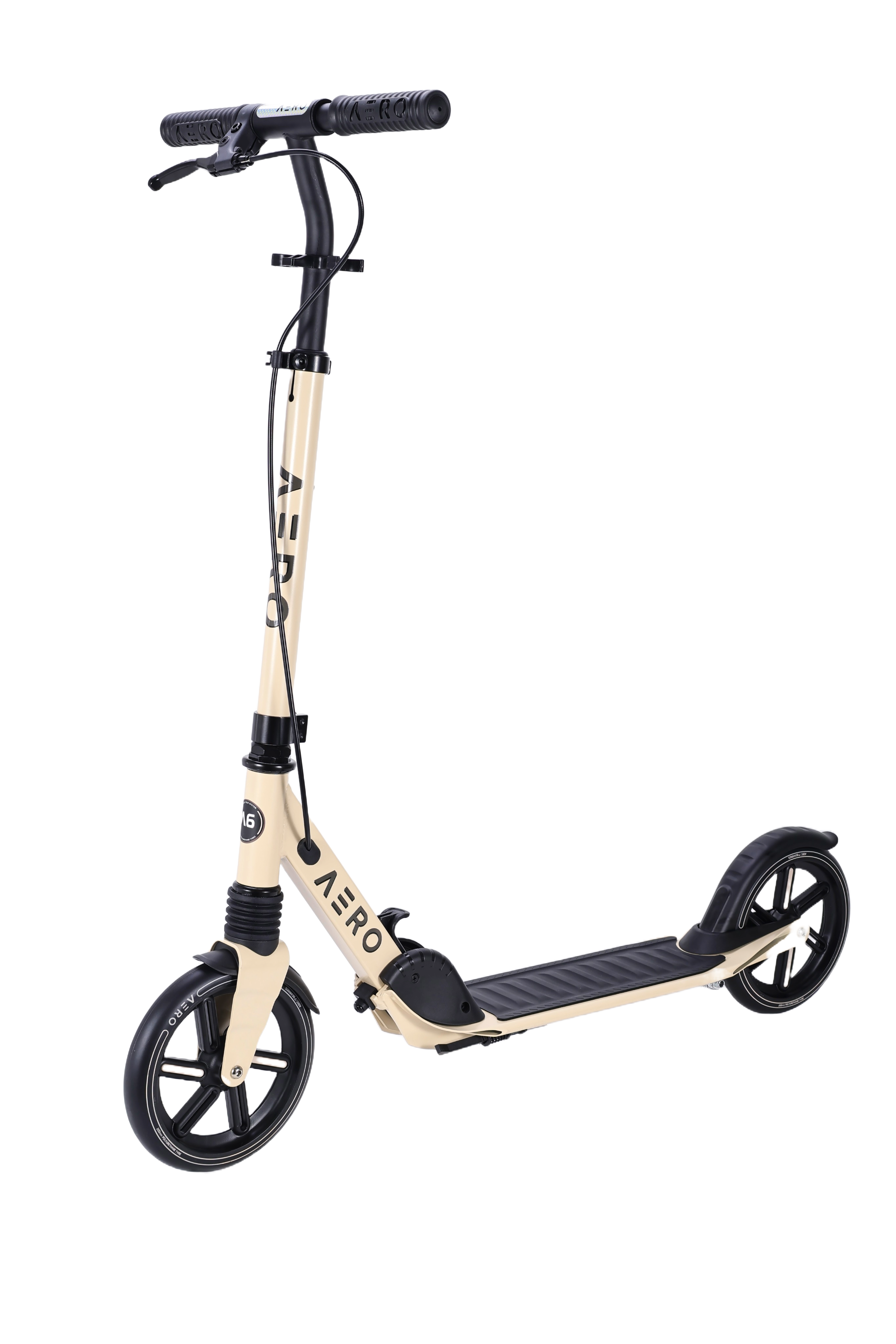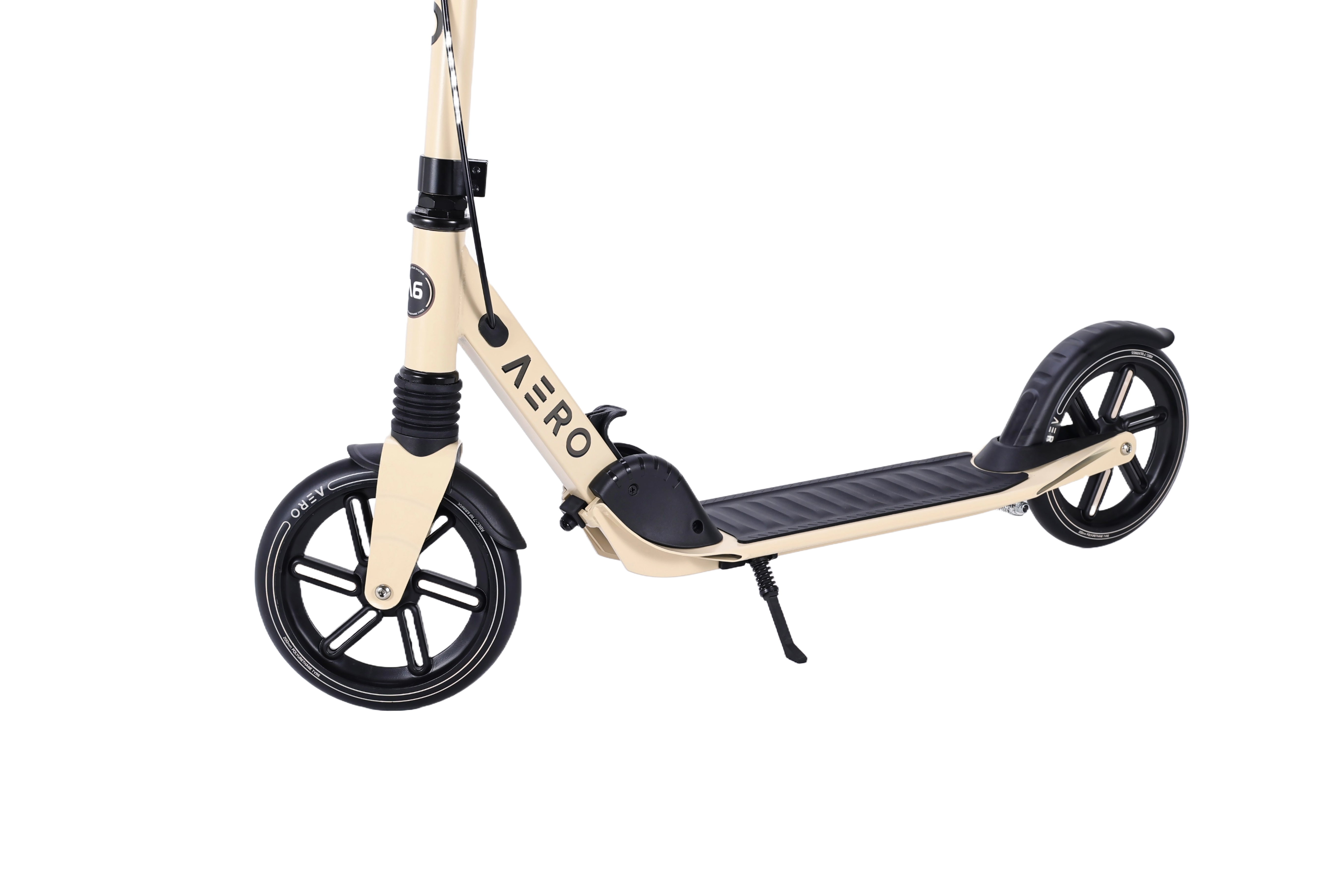 For children 8 years old + and Adults; Max Load: 100kg; Foldable and Height adjustable; Front Suspension; Kickstand included; Product Size: 93*37*99cm; Product Folded Size:87*41*38cm; Frame: Steel; Wheel: PU/200mm /85A; Brake system: hand brake and foot brake; Bearing: ABEC-7; Available colours: Beige or GreyThe AERO A6 kick scooter is specially designed for big kids 8-12, teens, and adults. It is perfect for both recreational sports and short-distance commuting.In additional to the standard foot brake, this adult 2 wheels kick scooter features a hand-operated brake for enhanced control and safety. This scooter for adults is equipped with 8” big PU wheels and built-in shock absorption, ensuring a smooth and comfortable ride on hard and uneven surfaces. This adult kick scooter comes with an extra wide deck with anti-slip rubber mat, which is soft and durable, and so you do not worry that it gets dirty or wet anymore.This adult scooter adopts a reliable folding mechanism. The handlebar height is can be adjusted to ‘evolve’ with your children ensuring a best fit for boys or girls ages from 8 to 12 years old, teens, big kids, youth as well as adults, as it supports up to 100kg.