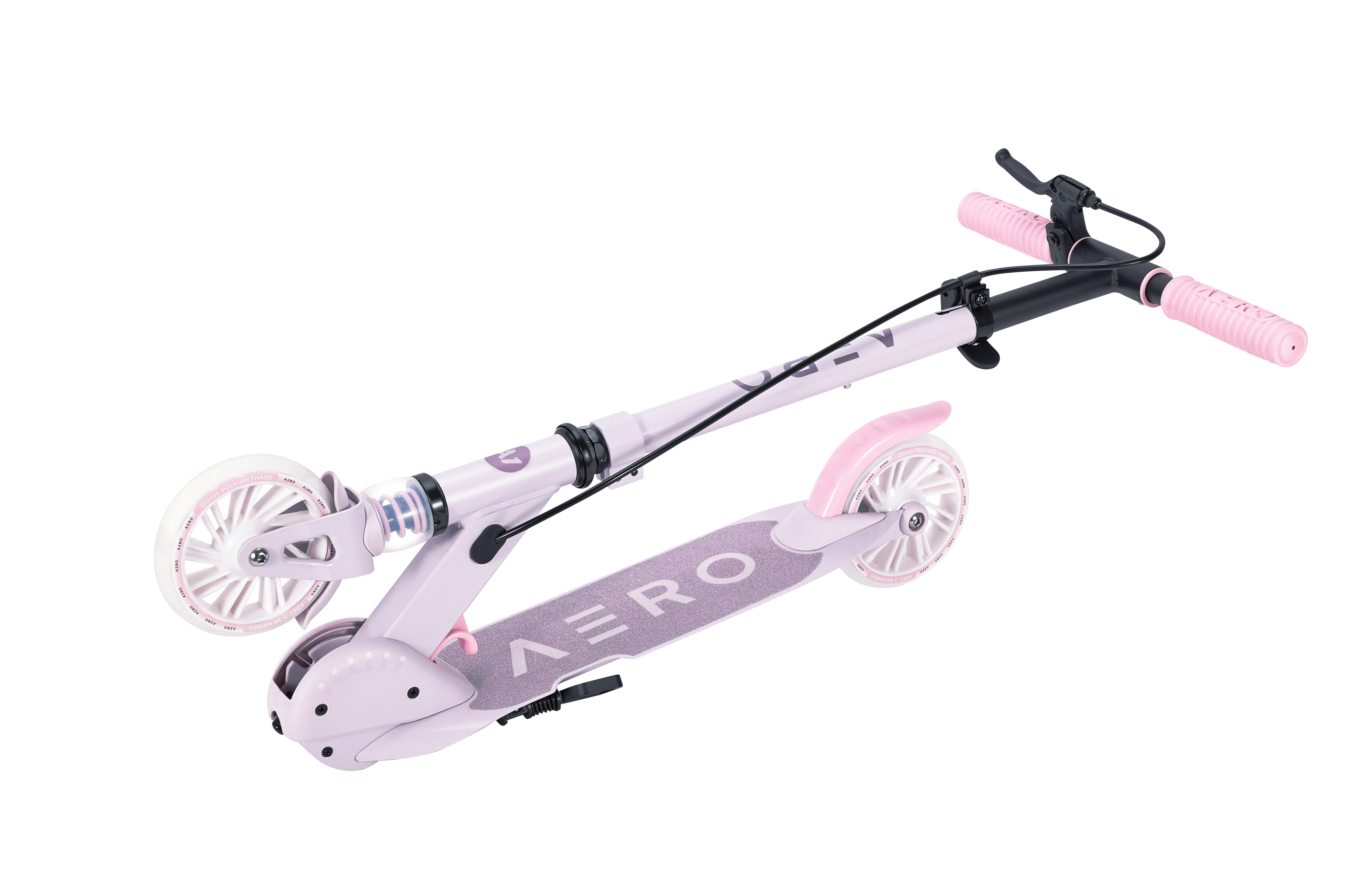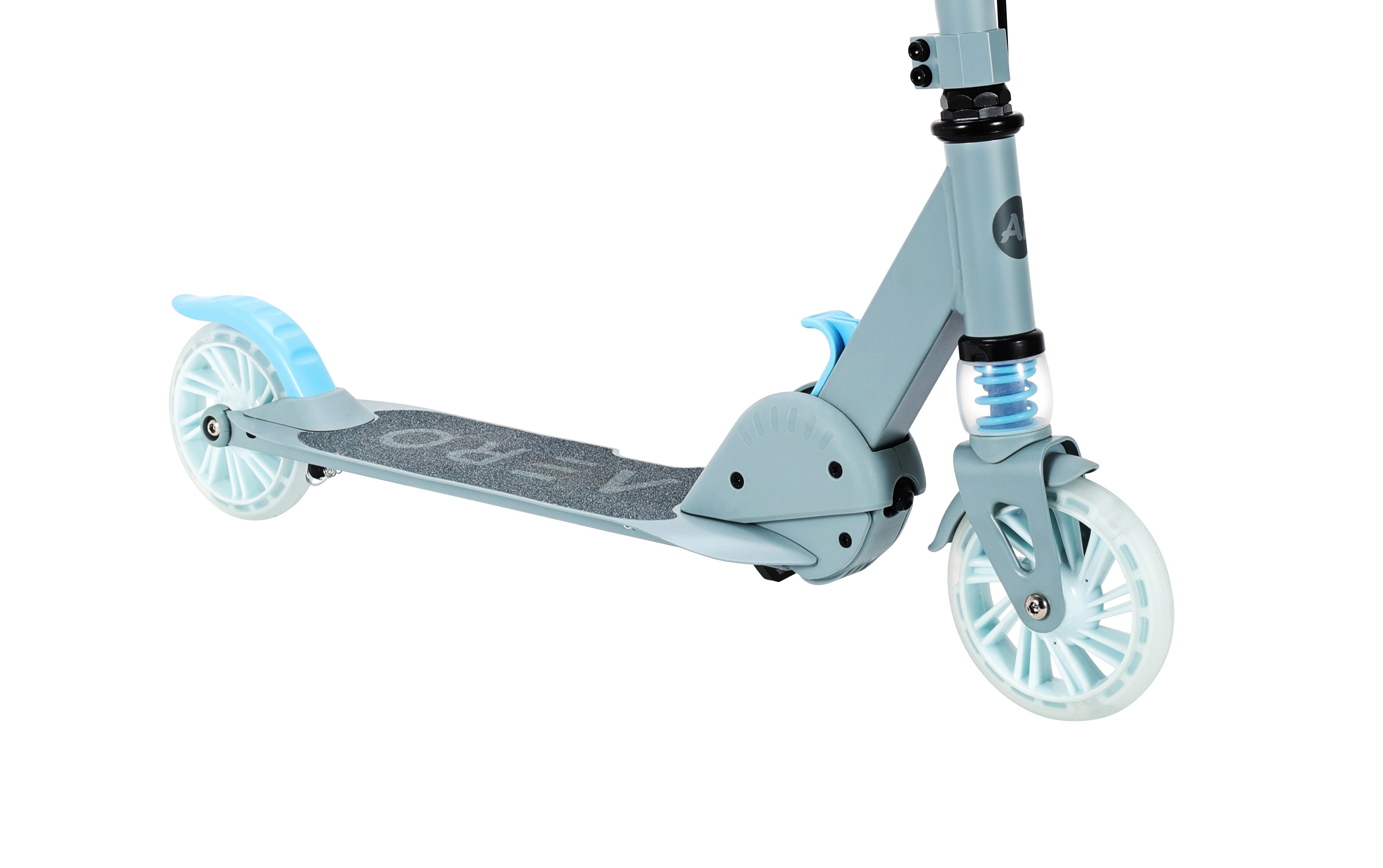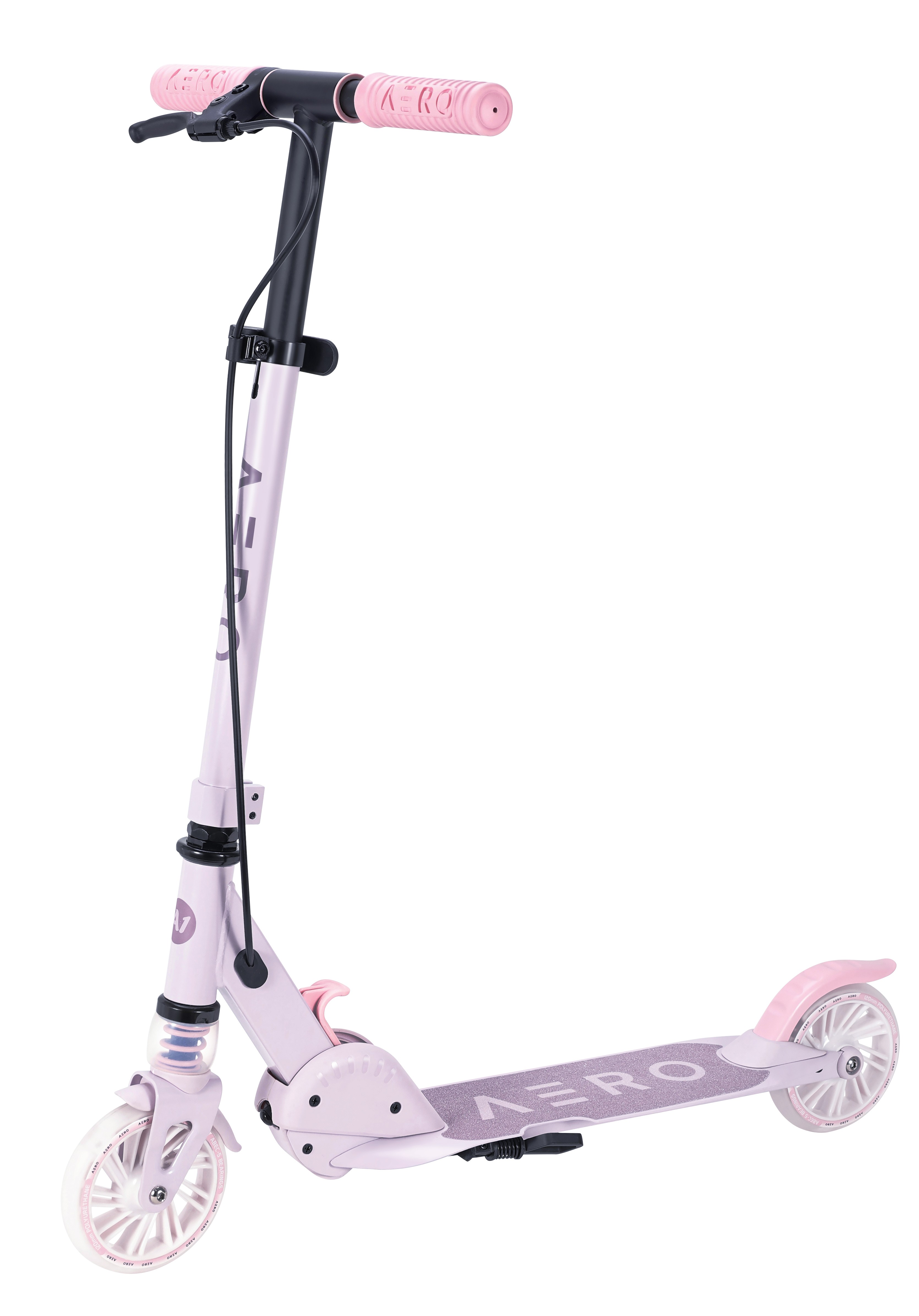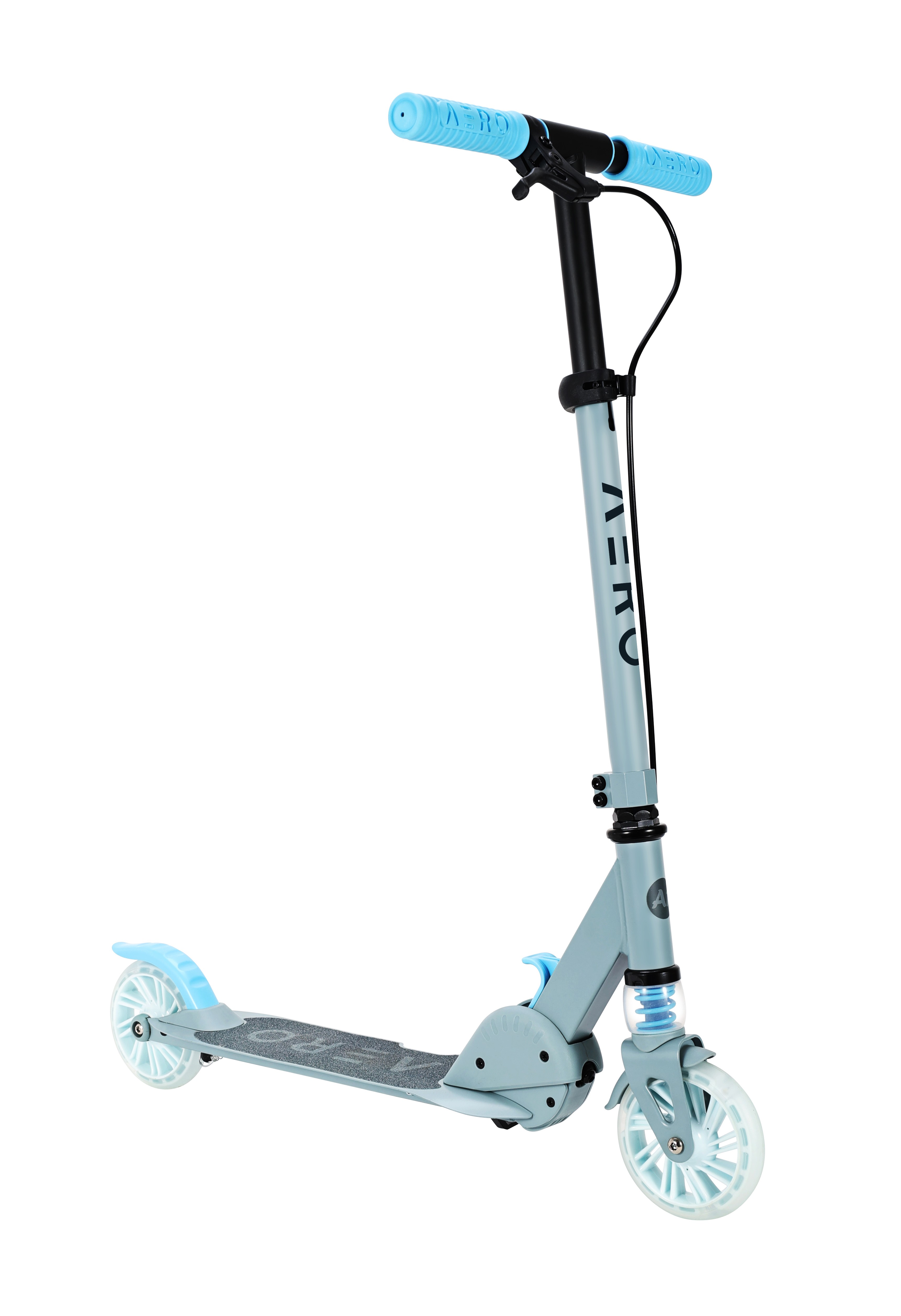 For children 5 years old +; Max Load: 50kg; Foldable and Height adjustable; Front Suspension; Kickstand included; Product Size: 67*33.5*82cm; Frame: Steel; Wheel spec:125 mm polyurethane(PU); LED Wheels; Brake system: hand brake and foot brake; Bearing: ABEC-5; Available colours: Blue or PinkAero A1 two wheels kick scooter is designed for kids ages 5+. It encourages boys or girls to get outside and exercise while having fun. In additional to the standard foot brake, this kids scooter features a hand-operated brake for enhanced control and safety. This scooter for kids is equipped high-rebound PU wheels and built-in shock absorption, ensuring a smooth and comfortable ride on hard and uneven surfaces. This children scooter comes with motion-activated light up wheels, making it one of the coolest rides on the planet. This 2 wheels kid scooter adopts our patented folding mechanism. The handlebar height grows with your child, ensuring a perfect fit for boys or girls ages from 5 year old, or up to 50 kg. Simply unfold your Aero Scooter, adjust the handlebar to your ideal height, and you're ready to go