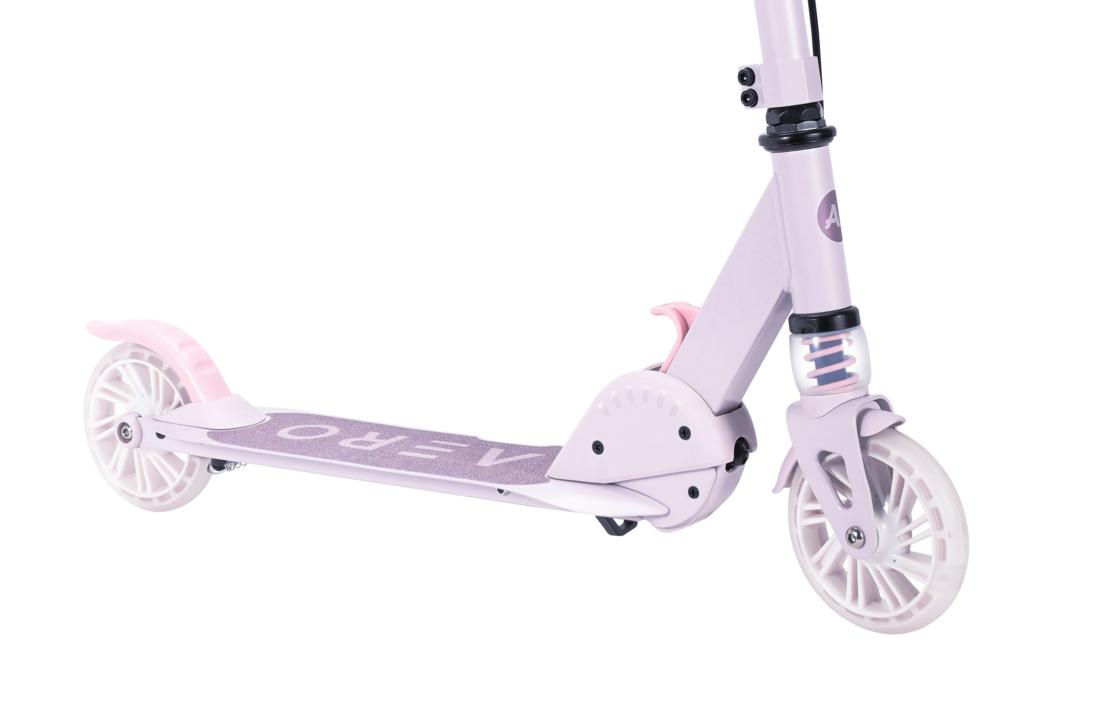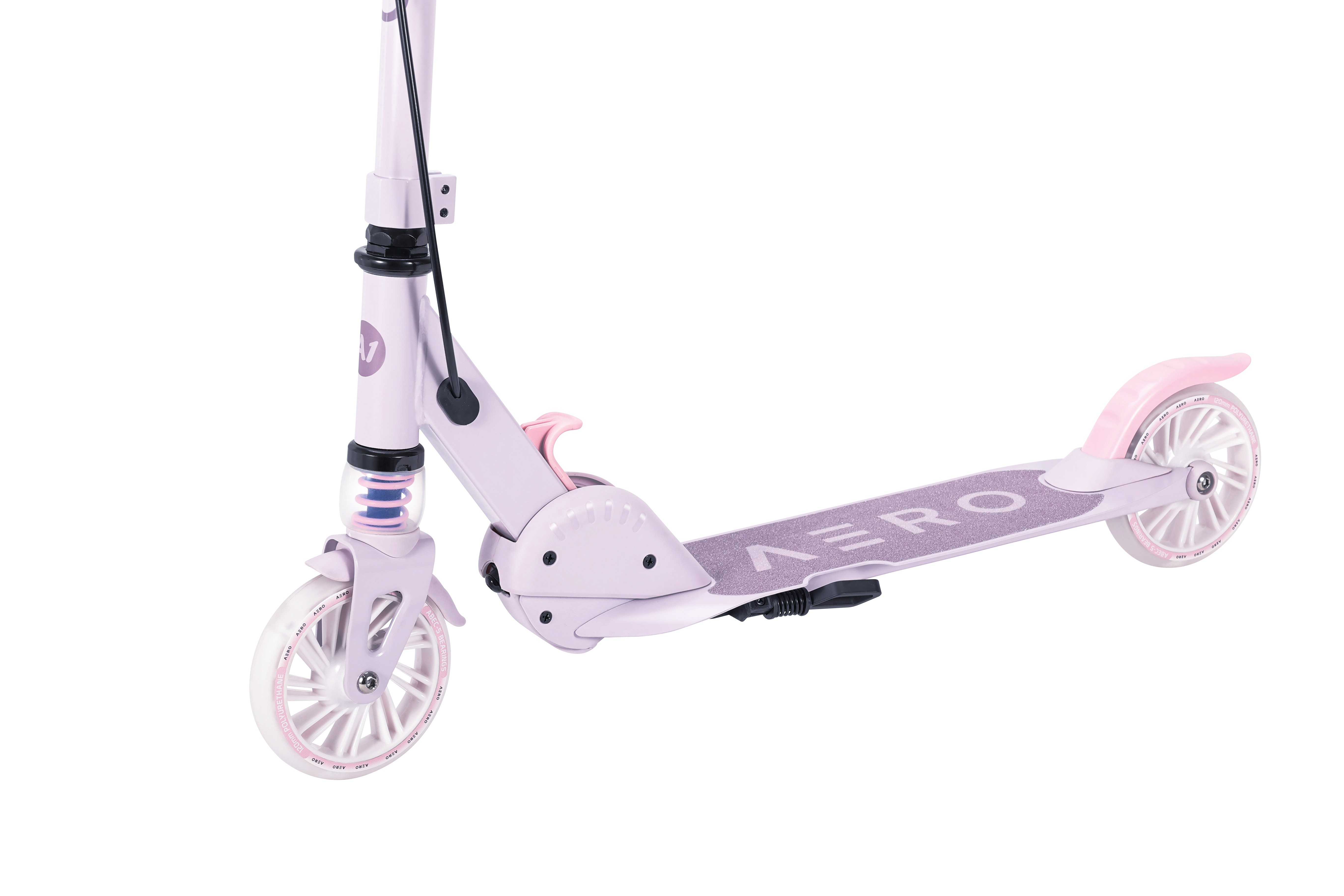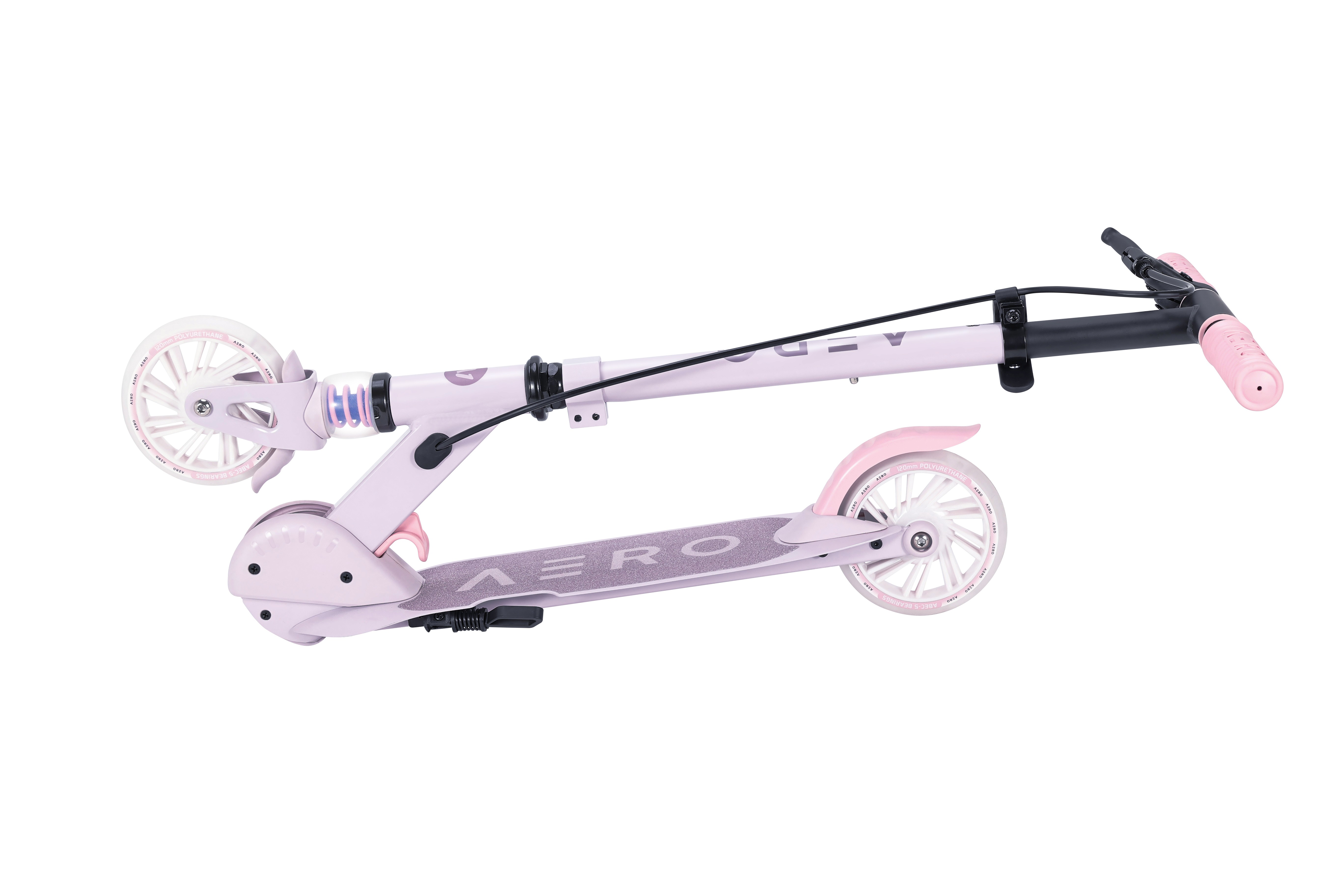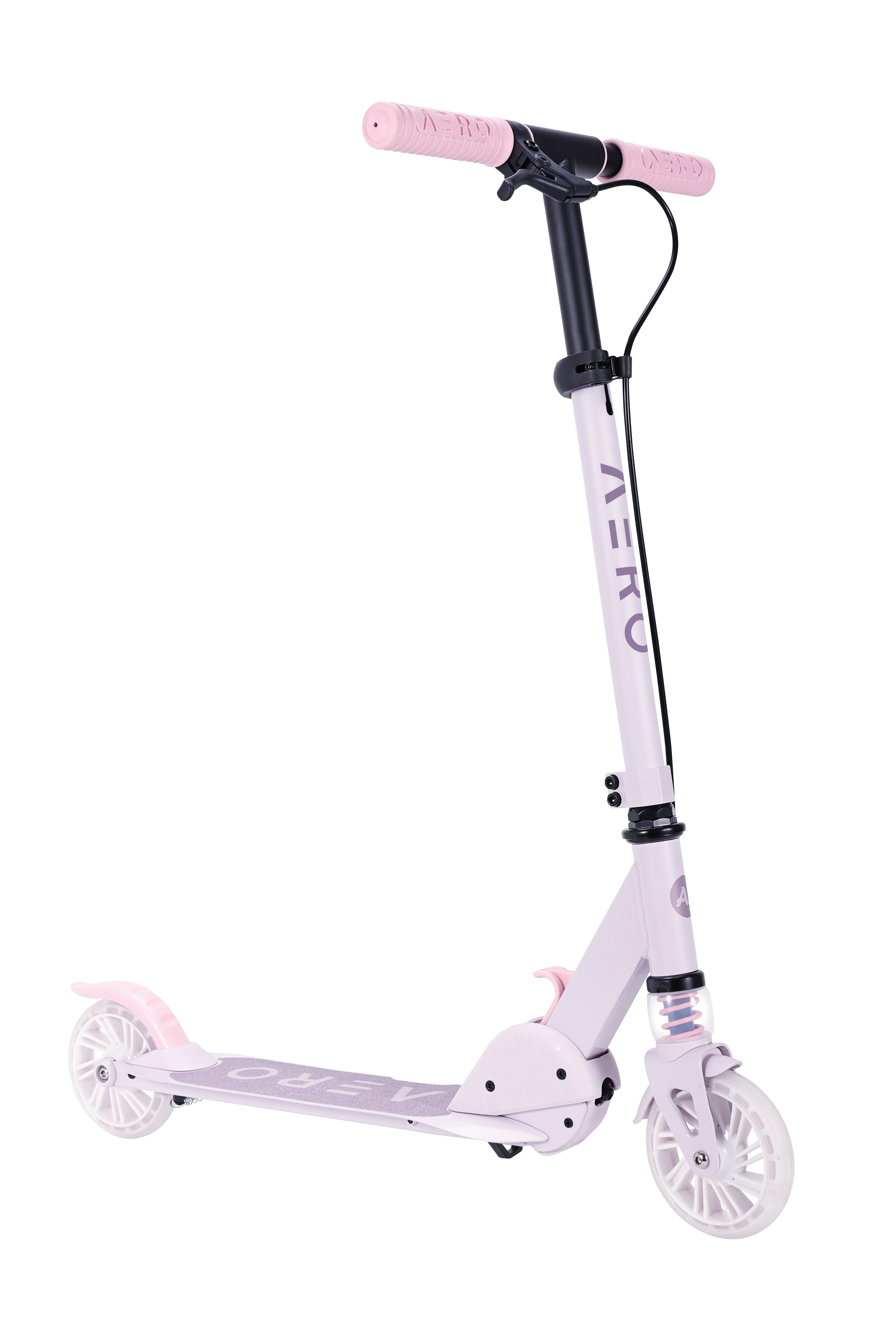 For children 5 years old +; Max Load: 50kg; Foldable and Height adjustable; Front Suspension; Kickstand included; Product Size: 67*33.5*82cm; Frame: Steel; Wheel spec:125 mm polyurethane(PU); LED Wheels; Brake system: hand brake and foot brake; Bearing: ABEC-5; Available colours: Blue or PinkAero A1 two wheels kick scooter is designed for kids ages 5+. It encourages boys or girls to get outside and exercise while having fun. In additional to the standard foot brake, this kids scooter features a hand-operated brake for enhanced control and safety. This scooter for kids is equipped high-rebound PU wheels and built-in shock absorption, ensuring a smooth and comfortable ride on hard and uneven surfaces. This children scooter comes with motion-activated light up wheels, making it one of the coolest rides on the planet. This 2 wheels kid scooter adopts our patented folding mechanism. The handlebar height grows with your child, ensuring a perfect fit for boys or girls ages from 5 year old, or up to 50 kg. Simply unfold your Aero Scooter, adjust the handlebar to your ideal height, and you're ready to go
