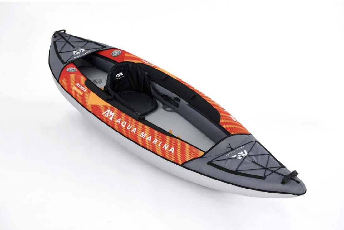Model: ME-285 • Size: 390cm x 90cm • Maximum Passenger: 2 • Net Weight: 17 kg • Max. Payload: 396lbs / 180kg • Warranty: 1 year Kayak paddles included. DWF Deck AQUASHELL™ Technology: Heavy-duty shell fabric with special anti-UV and water-repellent treatment for durability. ECO-PRINT™ Technology: Revolutionary digital printing technique for long-lasting graphic design and eco-friendly process. Drop Stitch Deck: Removable 7cm drop-stitch high pressure floor for ultimate stability and rigidity Streamlined Design: Sleek, curved, streamlined shape for good tracking performance Water shield preventing splash from flowing backwards to the cockpit Adjustable cargo bungee system to easily fasten the luggage Drain Valve: Superfast 1+2 self-bailing valves can be left open for quick water drainage in whitewater and ocean kayaking or closed for flat-water paddling. • Paddle Holder – Velcro paddle holder design for easy paddle lock • Carry Handle – Front, rear and center rubber carry handles for easy transport • D-buckle – Multiple strap D-buckles allow seat position adjustment • Valve – High pressure recessed valve for quick inflation and deflation • Seat System – Premium high-backrest seat with EVA cushion and storage pockets • Fin System – High performance two center fins for excellent straight-line tracking • Hand Pump – Upgraded gauged pump for easy and accurate inflation • Backpack – Functional zip backpack wrapping everything inside for a kayak tourFeaturing a sleek, curved and touring shape, the MEMBA series excels in tracking and speed with the extra-long waterline. Perfect for the adventurers looking for an efficient long-distance touring kayak.