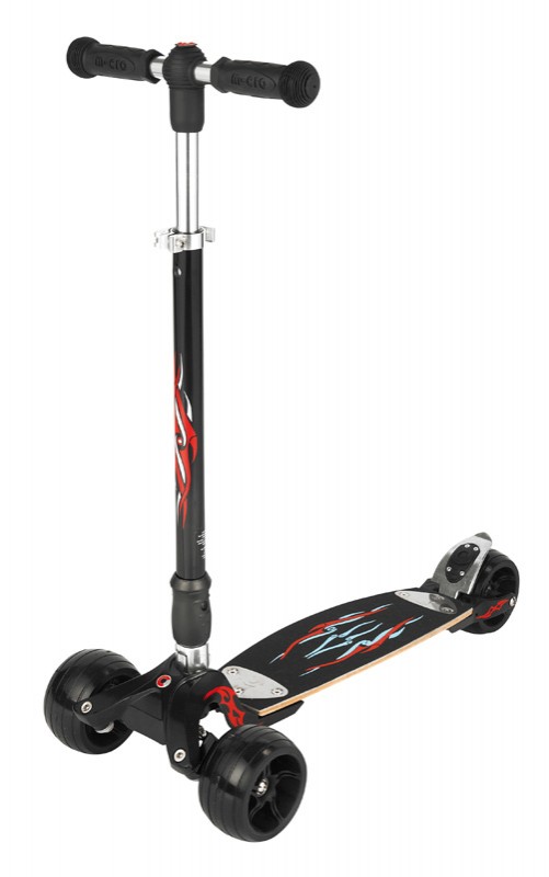 For children from 7 years old to adults Max Load: 100 kg Three wheels: Lean and Steer System Wheel size: 120mm Extra-Wide Wheel Material: PU Tbar Height: 69.5cm - 102 cm Tbar Foldable & Adjustable Product Weight: 5,3 kg Available colours: Black with Red Tribal Design and Volcano Grey Patented, Swiss designThe Monster Kickboard Scooter with interchangeable T-Bar is the ultimate boys' toy. Fitted with a composite deck this model also includes 100mm FATTIES wheels all round for extra grip. Its extra wide wheels and flexible deck make it really unique! The Micro Kickboards convey, thanks to the special weight transfer steering, an ultimate feeling of surfing. With its extra wide wheels and spring-loaded deck, Micro's Kickboard Monster guarantees a smooth and comfortable ride. The unusual design is an eyecatcher! Now with interchangeable T-bar: change easily between the joystick steering and T-bar steering whenever you want. Are you ready for the monster look?