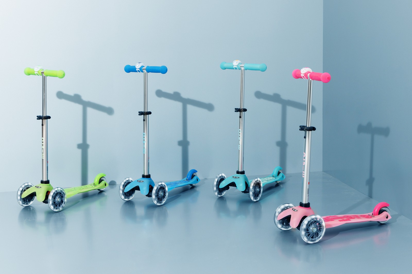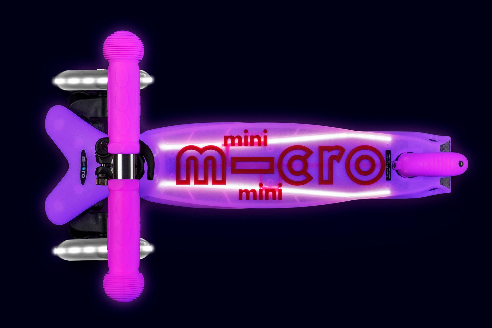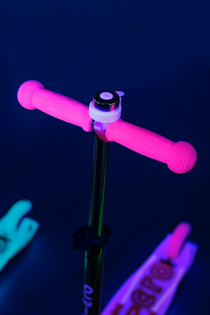 The magic of the Mini Micro Deluxe Glow LED Plus is enhanced by two additional LED strips enbedded in the deck. These strips, ingenuously powered by the rear wheel’s motion, cast a radiant glow increasing both the scooters allure and safety. The scooter’s LED wheels further amplify this enchantment, adding a mesmerizing touch to every turn and glide.