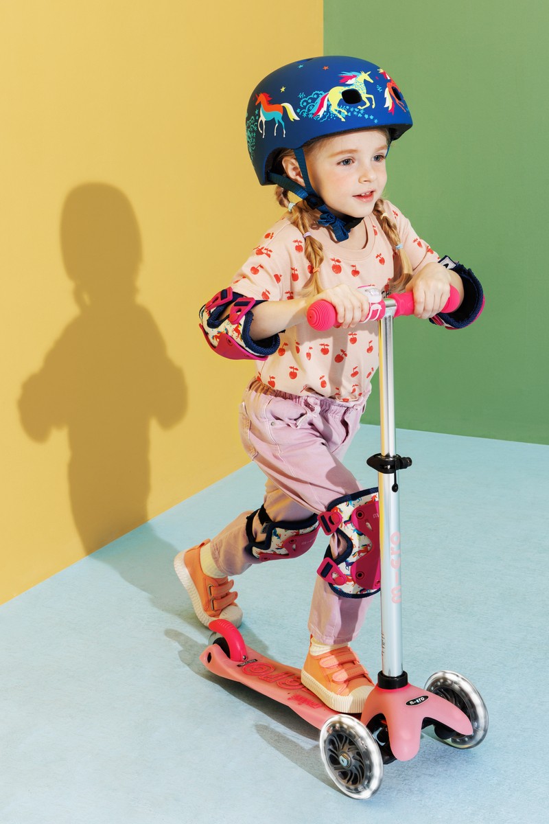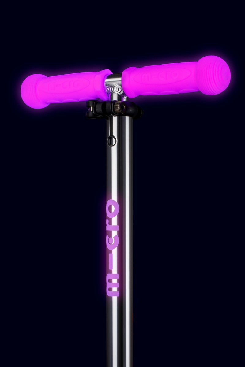 Elevate your child’s outdoor escapade with the enchanting Mini Micro Deluxe Glow LED Plus! This extraordinary scooter transferoms evening rides into a captivating light show! As dusk falls, the scooter’s footboard, handles, brake and handlebar logo, begin to glow mystically all without the need for batteries. Charged by sunlight or artificial UV light, these glowing elements create a delightful and safe spectacle.