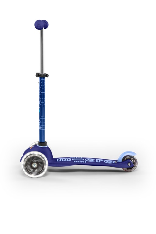 For children 2 to 5 years old Max Load: 50kg Three wheels for superior stability Wheel size: 120/80mm Wheel Material: PU Tbar Height: 49-67cm Tbar Removable and adjustable Lowered board with strengthening flexiglass Deck: Reinforced fibreglass PA, Extra grippy silicone mouldings Product Weight: 1,95 kg Available colours: Blue, Purple, and Red Patented, Swiss designThis Micro Scooter glows with motion-powered LED wheels generated through dynamo mechanics. The wheels’ dazzling illumination not only makes riding your scooter more fun, it also enhances your visibility in the dark. In contrast to the classic Mini Micro, the Deluxe version has a height-adjustable handlebar, which is equipped with a safety system for children. However, parents can still easily remove the handlebar to stow the scooter under the stroller or in the trunk. The non-slip silicone footboard provides additional support and a safe ride. Thanks to the patented steering mechanism, this unique toy promotes not only movement but also balance and motor skills of the little ones. It was developed in cooperation with medical specialists especially for pre-school children. With the large selection of colours, every child will find their new favourite scooter!
