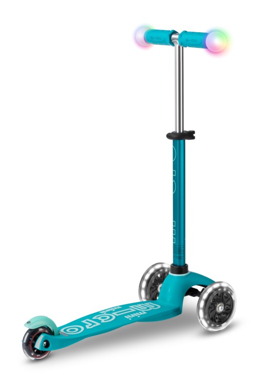 For children 2 to 5 years old Max Load: 50kg Three wheels for superior stability Total length: 550mm Wheel size: 120/80mm Wheel Material: PU Tbar Height: 49cm - 67cm Tbar Removable and Adjustable Product Weight: 2,13 kg Available colours: Aqua and PinkMagic driving fun on three wheels! As soon as your child touches the handlebar of the Mini Micro Deluxe Magic, the integrated touch sensor makes the LED lights on the handlebar shine in five different colours. This not only increases the fun factor, but also the visibility and safety in the dark. In addition, the scooter with its patented steering system promotes balance, coordination and motor skills. The anti-slip coating on the running board ensures a secure footing and the height-adjustable steering bar ensures maximum driving comfort. The robust light balls are made of shock-absorbing plastic and are waterproof. The batteries can be easily replaced thanks to a simple twist lock.